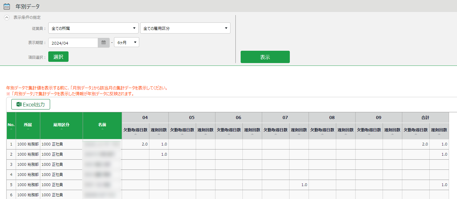 年別データ活用例:2024年4月から9月の6か月間の欠勤、遅刻の回数(月別、6か月合計)