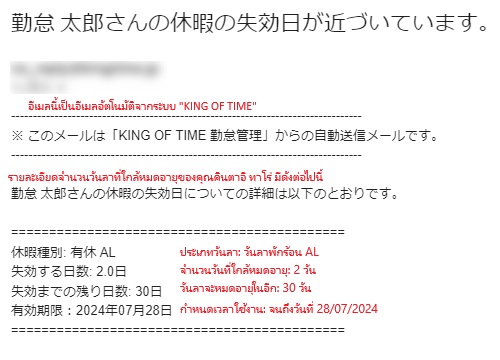 และในกรณีที่สิทธิวันลาที่ใกล้จะหมดอายุยังไม่ถูกใช้งาน ตัวระบบ KING OF TIME ก็มีฟังก์ชันแจ้งเตือนผู้ใช้งาน (ตัวพนักงาน) หรือผู้ดูแลระบบ (แอดมิน) ผ่านทางอีเมลด้วย